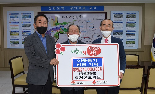 김제시 금산면에 소재하고 있는 형제콘크리트와 삼흥산업 운영중인 송영기 사장은 지난 26일 관내 저소득층을 위해 사용해 달라며 현금 각 1천만원을 김제시에 기탁했다.