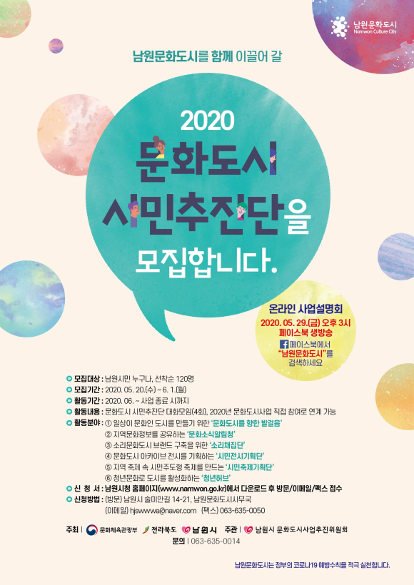 이번 모집을 통해 선발된 120명의 참여자는 6월부터 올해 문화도시 사업 종료 시까지 활동할 예정이며, 생활 속 거리 두기 실천 차원에서 분야별 소단위로 모이게 된다. 오는 5월 29일(금) 오후 3시에는 시민의 이해를 돕기 위한 설명회를 남원문화도시 페이스북을 통해 온라인으로 진행할 예정이다.