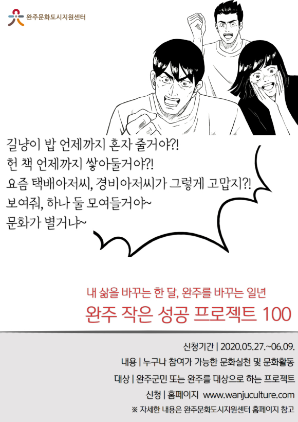 <작은성공 프로젝트 100>은 27일부터 6월 9일까지 1차 프로젝트 접수를 시작하며, 보다 자세한 내용은 완주문화도시지원센터 홈페이지(www.wanjuculture.com)를 통해 확인해 볼 수 있다.
