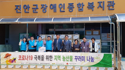진안군장애인종합복지관(관장 배인재)은 27일 한국수자원공사 전북지역협력단(단장 이화익)과 함께 코로나19 극복을 위한 지역 농산물꾸러미 나눔 활동을 전개했다. 이 사업은 전북사회복지공동모금회의 지정기탁을 받아 진행됐다.