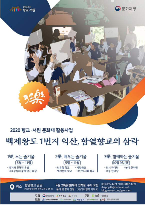 이번 향교·서원 문화재 활용사업은 5월부터 11월까지‘백제왕도 1번지 익산, 함열향교의 3락(三樂)’의 주제로 ▲1樂. 노는 즐거움, ▲2樂. 배우는 즐거움 ▲3樂. 함께하는 즐거움 등 3개 테마로 진행된다.