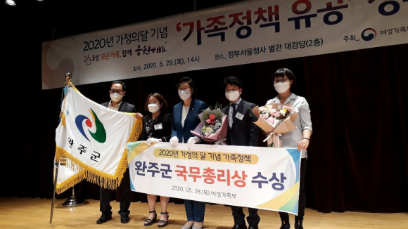 28일 완주군은 여성가족부에서 주최한 ‘2020 가정의 달 기념 가족정책 유공 정부포상 시상식’에서 국무총리상을 수상하며 전국 최고 수준의 가족정책 운영기관으로 인정받았다.