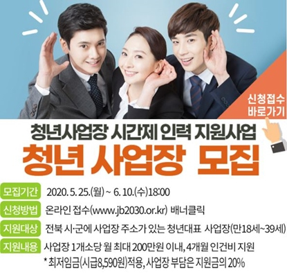 또한 ‘청년사업장 시간제 인력 지원사업’은 ‘20. 4. 30일 기준, 상시근로자 5인 미만인 관내 청년사업장(만 18~39세)에서 시간제 청년을 신규고용 시 월 최대 200만원씩 인건비의 80%를 4개월간 지원하는 사업이다.