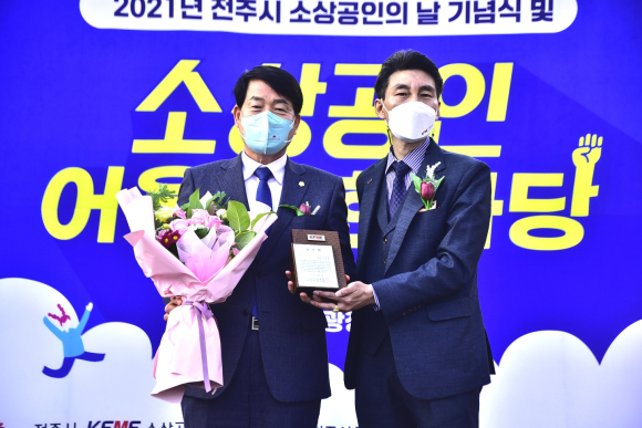 전주시의회 강동화 의장(진북, 인후1·2동, 금암 1·2동)이 지난 19일에 열린 ‘2021년 전주시 소상공인의 날 기념식’에서 소상공인연합회 전주시회(회장 임규철)로부터 소상공인 경제 활성화에 기여한 공로로 감사패를 받았다.