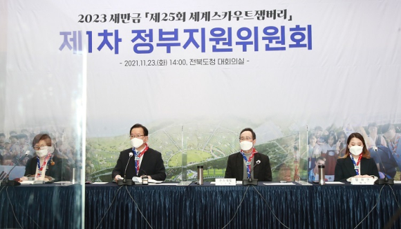 11월 23일 전북도청에서 열린 2023년 새만금세계스카우트잼버리 제1차 정부지원위원회(이하 ‘정부지원위원회‘)는 김부겸 국무총리, 송하진 도지사, 각 정부 부처 장관 등 12명의 정부위원과 청소년․행정․경제 등 각계 분야 민간위원 8명 등 20명이 함께하여 정부 부처와의 협력이 필요한 과제들을 정리하고 추진상황을 점검했다.