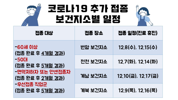 군에 따르면 오는 12월 7일 화요일부터 일정에 맞춰 위탁의료기관이 미설치 된 번암면, 천천면, 계남면, 계북면 4개 면 보건지소에서 코로나19 백신 추가접종(부스터샷)을 시행할 계획이다.