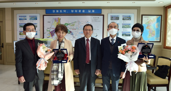 미주 김제향우회 강성준 회장은 지난 26일(금) 김제시청 시장실에서 김제시외국어자원봉사회(회장 김은순)와 ㈜소리소(대표 최향자)에 마스크 후원에 대한 감사패를 전달하였다.