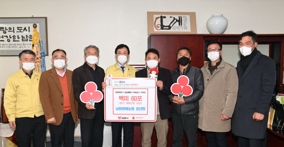 남원시는 12월 6일 남원원예농협 청년회(회장 정병용)에서 관내 소외이웃 에게 나눌 백미 60포대(10kg) 환가액 3백만원 상당을 남원시에 전달하였다고 밝혔다.