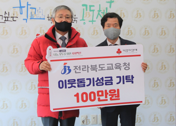 사랑의열매달기 캠페인은 도내 주요 기관장이 나눔 문화 확산을 통해 연말연시 및 코로나19를 함께 극복하고 회복하고자 함께 하는 캠페인으로 김승환 교육감과 김동수 회장이 자리를 함께 했다.