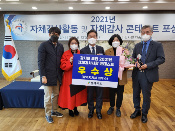 전라북도는 감사원이 지난 11월에 발표한 2021년 자체감사활동 평가 4년 연속(2018년~2021년) 광역자치단체 최우수기관으로 선정된 데 이어 전국 667개 중앙부처, 자치단체, 공기업 등의 자체감사기구를 대상으로 실시는 ‘2021년 자체감사사항 콘테스트’에서 우수상을 수상하였다고 밝혔다.