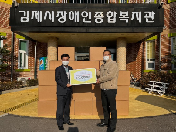 이날 전달받은 덴탈 마스크 5만장은 김제시장애인종합복지관 내 장애인들과 김제시장애인종합복지타운내 이용인들에게 전달될 예정이다.