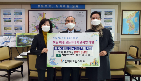 김제시 관계자는 “소외아동 100가정에게 사랑의 쌀을 지원해 주어 진심으로 감사드리며, 올 겨울 힘들게 보낼 한부모 조손 장애인가정 등 지원이 꼭 필요한 가정에 소중히 잘 전달하겠다”고 밝혔다.