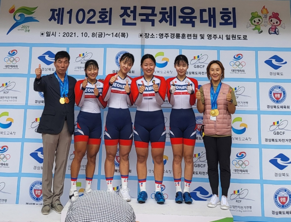 제102회 전국체전 둘째 날 자전거 4km 단체추발에서 전북체고 김혜진(3학년), 이효은(3학년), 지민재(2학년), 한민아(2학년) 4총사가 여고부 우승을 거머쥐었다.