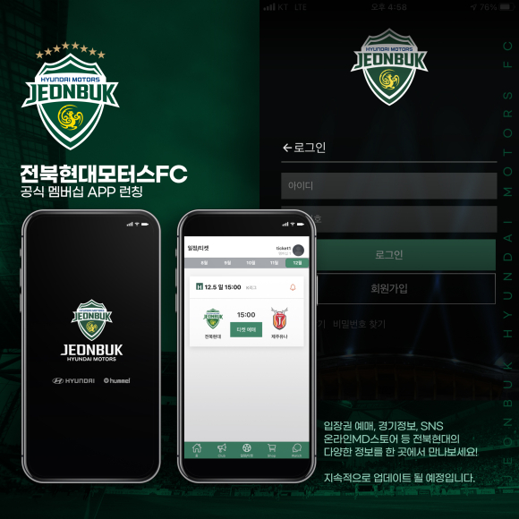 전북현대 새로운 애플리케이션은 지난달 26일부터 플레이 스토어와 앱 스토어를 통해 다운로드 가능하다.