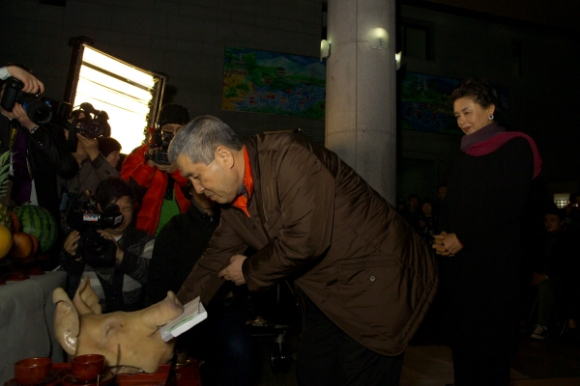 ↑↑ 임권택 영화감독이 영화 ‘달빛 길어올리기’ 의 성공을 기원하며 고사상에 술을 따르는 모습.