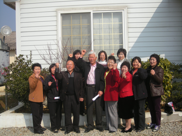 | ↑↑ 고창군 심원면 주민들이 대한적십자 심원면봉사회 창립총회를 마치고 화이팅 하고 있다. 가운데 머리하얀 인물이 이옥용 초대회장. |