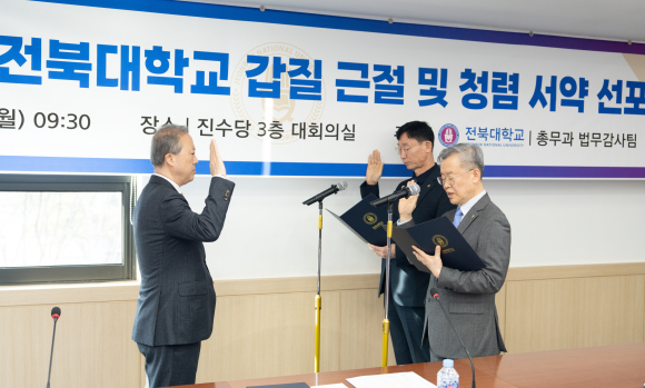 전북대학교(총장 양오봉)가 대학 내 갑질 행위 근절과 청렴 문화를 확산하기 위해 3월 10일과 11일 ‘갑질 근절 및 청렴 실천 서약 행사’를 개최했다.