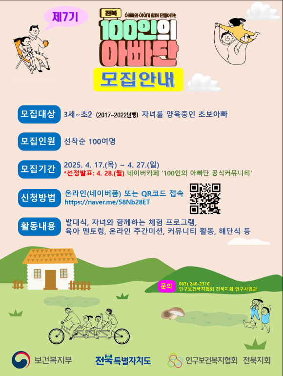 전북특별자치도가‘제7기 전북 100인의 아빠단’을 모집한다. 신청 기간은 오는 4월 27일까지이며, 도내에서 자녀를 양육 중인 아빠들의 적극적인 참여가 기대된다.
