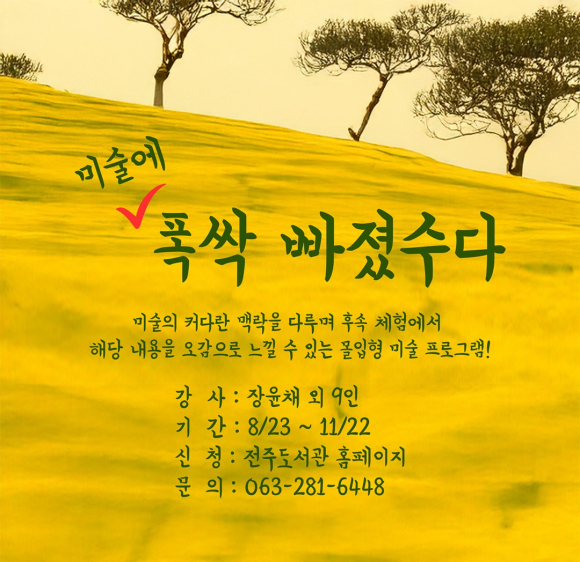 전주시 금암도서관은 오는 8월 23일부터 11월 22일까지 매주 토요일, 총 11회에 걸쳐 ‘미술에 폭싹 빠졌수다’ 프로그램을 운영한다.