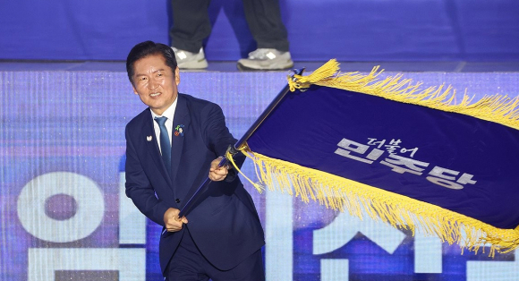 | ↑↑ 더불어민주당 당기를 흔들고 있는 정청래 더불어민주당 대표. |