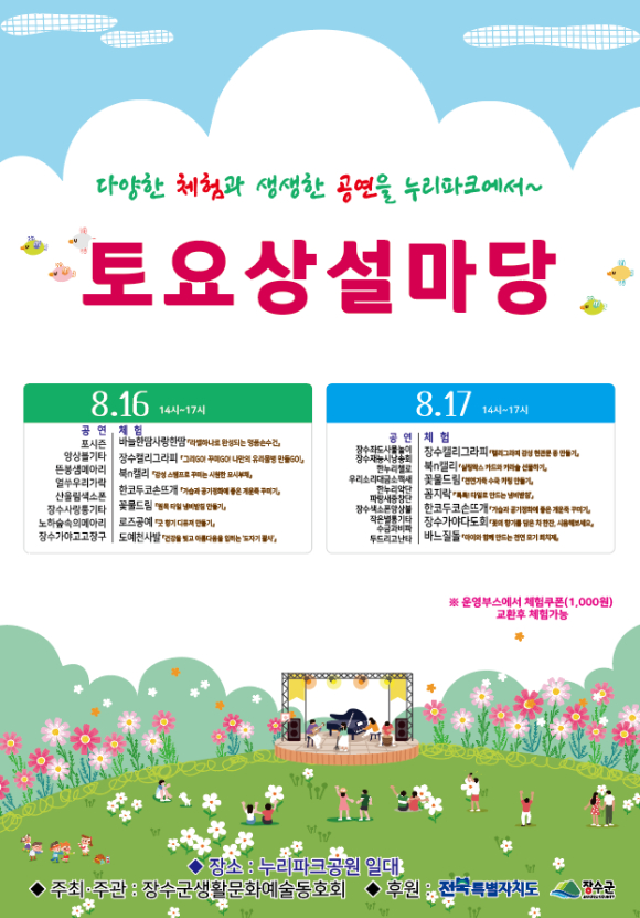 장수군이 후원하고 생문동이 주관하는 이번 ‘토요상설마당’은 장수 지역 주민들이 일상 속에서 문화예술을 쉽고 친근하게 접하고 즐길 수 있도록 기획된 행사로 지역 주민의 문화 나눔을 실현할 수 있도록 다채로운 공연과 전시·체험으로 이루어질 예정이다.