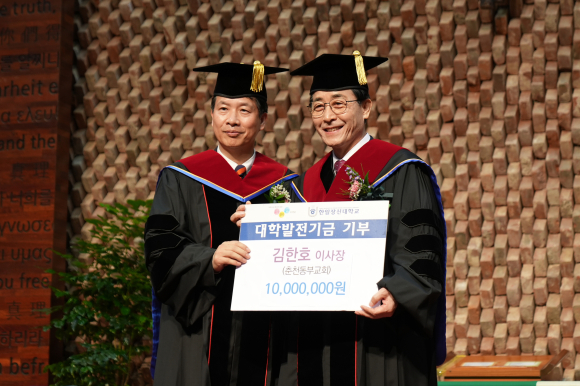| ↑↑ 지난 10월 16일 이사장 이취임 및 총장 취임예식에서 김한호 이사장(왼쪽)이 황세형 총장에게 발전기금을 전달하고 있다. |