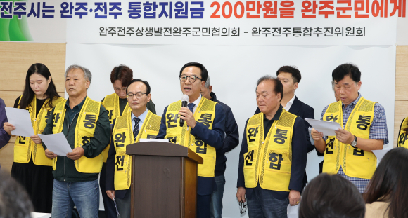 전주·완주 통합을 찬성하고 추진하고 있는 2개 단체가 완주·전주통합추진위원회의 명의로 완주군민 1인당 200만원의 통합지원금을 전체 완주군민에게 지급해줄 것을 우범기 전주시장과 남관우 전주시의회 의장에게 건의했다. 이에 따라 전주시와 전주시의회의 대응이 주목된다.
