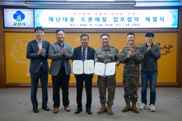 군산시와 제9585부대 1대대는 3일 군산시청에서 ‘드론 예찰활동 업무협약’을 체결하고, 재난·재해 예방과 지역 안전 강화에 협력하기로 했다.