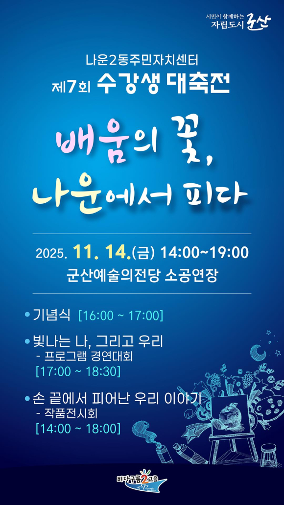 군산시 나운2동(동장 남귀우)과 나운2동 주민자치위원회(위원장 이백만)가 14일 군산예술의전당 소공연장에서 「제7회 수강생 대축전 – 배움의 꽃, 나운에서 피다」를 개최한다.