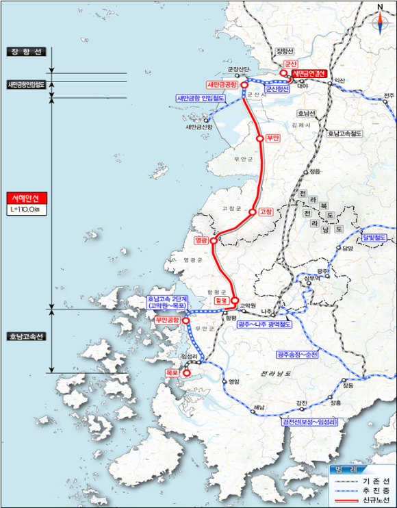 서해안철도 노선은 총연장 110km, 총사업비 4조7919억원 규모다. 서해선(서화성~홍성)과 장항선(홍성~군산), 새만금선(군산~새만금)을 잇는 서해안 철도축의 마지막 단절구간을 메우는 핵심 구간이다.