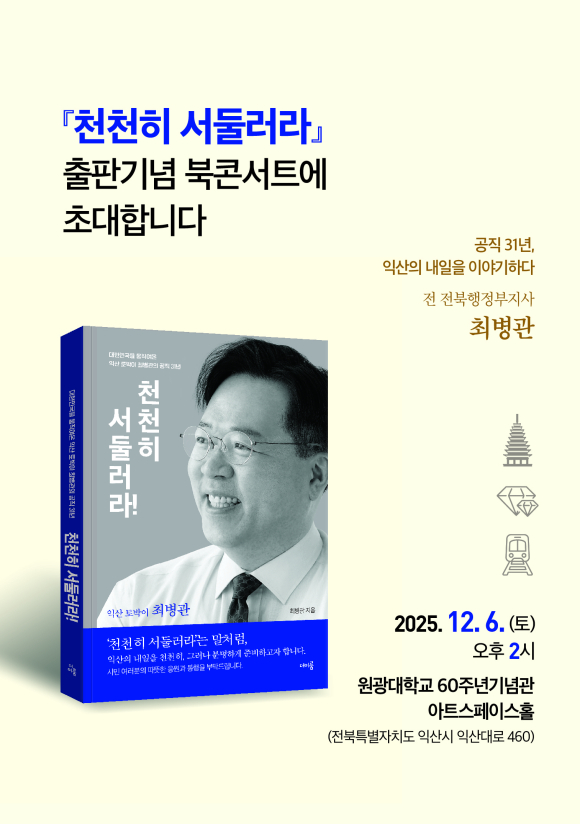 최병관 전 전북행정부지사(젊은익산다음만들기포럼 대표)의 자서전 ‘천천히 서둘러라!’의 출판을 기념하는 북콘서트가 수천여 명의 시민이 운집한 가운데 성황리에 개최됐다.