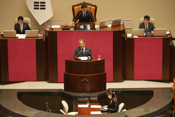 | ↑↑ 윤준병 더불어민주당 전북특별자치도당위원장이 도당 운영 방침과 정책 비전, 그리고 내년 지방선거 후보 공천에 대한 원칙에 대해 설명하고 있다. |