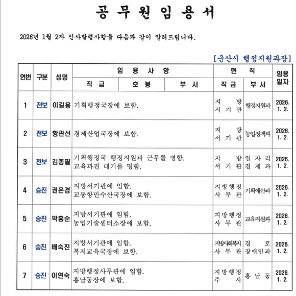 # 군산시 2026년 정기 인사(1월2일자)