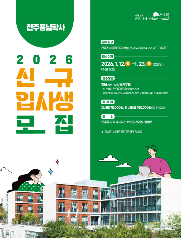 전주시는 오는 1월 12일부터 23일까지 수도권 소재 대학에 진학한 전주·완주 출신 대학생을 대상으로 2026년도 신규입사생 43명을 모집할 계획이라고 2일 밝혔다.