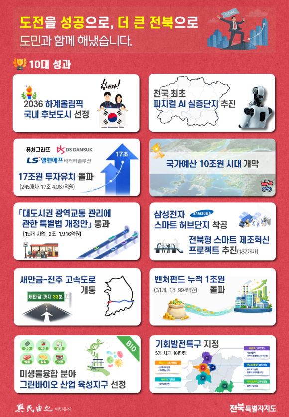 전북자치도는 지난 3년여 이어온 끊임없는 도전과 이뤄왔던 성과 위에서 한계를 뛰어넘고 기대를 충족하는 성취를 이뤄내, 그 결실이 도민의 삶 전반에 온전히 공유되도록 하겠다고 밝혔다.
