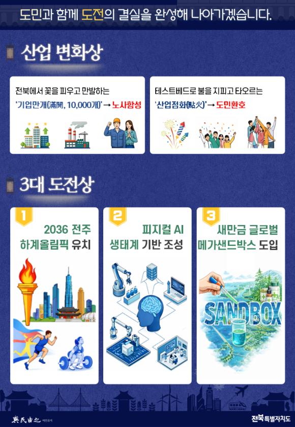 2026년, 전북특별자치도의 시계는 분명한 전환점을 가리킨다. 그간의 ‘도전’이 ‘성과’로, 계획이 ‘변화’로, 비전이 ‘삶’ 속 체감으로 이어지는 시기다.