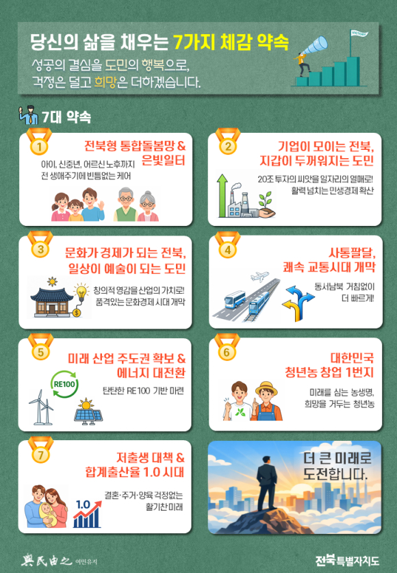세부적으로는 ▲도민을 온전히 지키는 복지·안전사회 ▲포용적 경제로 다시 일어서는 기업·소상공인 ▲K-컬처로 세계와 연결되는 전북 ▲새만금과 교통 대동맥으로 여는 대한민국 지방시대 ▲첨단 新산업기지로 태동하는 혁신, 열리는 미래 ▲대한민국 첨단 농생명산업수도, 전북 ▲‘5극3특’ 테스트베드 전북특별자치도 등으로 구성돼 있다.