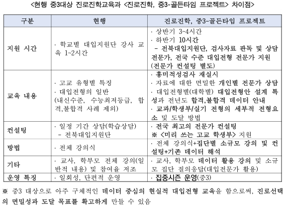 이를 뒷받침하기 위해 교육청은 중3 과정에 진로진학설계 시간을 집중 배정하고(2배 이상) 흥미적성검사, 각종 정보제공, 맞춤상담을 다각도로 지원해야 한다고 밝혔다.