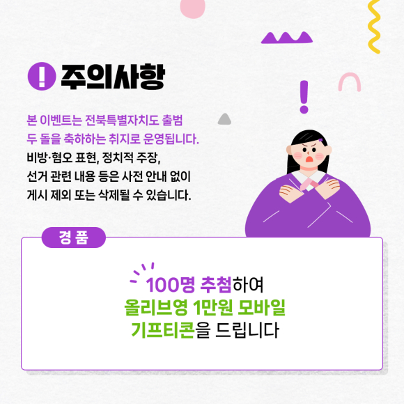 전북자치도 관계자는 “전북특별자치도 출범 2주년은 제도 출범 자체를 기념하는 데 그치지 않고, 그동안의 변화와 성과를 도민과 함께 돌아보고 앞으로의 방향을 공유하는 의미 있는 시점”이라며, “이번 이벤트가 도민 한 분 한 분의 목소리를 듣고 도정에 대한 공감과 신뢰를 넓히는 계기가 되길 기대한다”고 말했다.