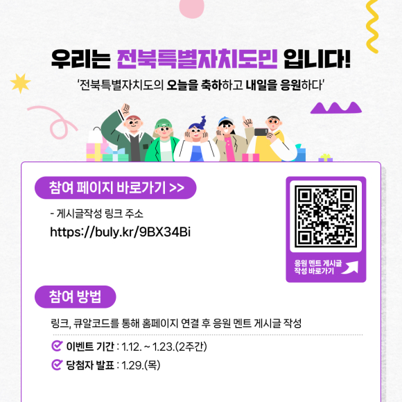 전북특별자치도는 출범 2주년을 맞아 도민이 직접 참여하는 ‘도민 참여 축하·응원 메시지 이벤트’를 1월 12일부터 23일까지 운영한다.