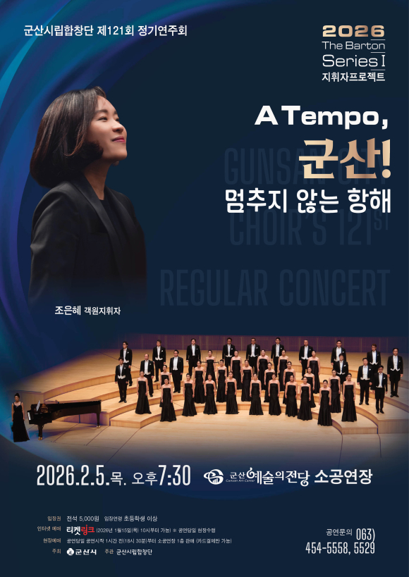 군산시립합창단이 제121회 정기연주회 ‘2026 The Barton Series Ⅰ 지휘자 프로젝트- A Tempo, 군산! 멈추지 않는 항해’를 오는 2월 5일 저녁 7시 30분, 군산예술의전당 소공연장에서 개최한다.