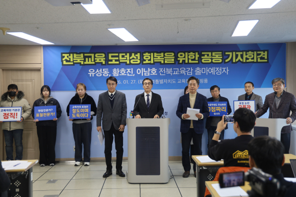 오늘 유성동, 황호진, 이남호 세 명의 교육감 출마예정자는 참담한 심정으로 전북교육이 앞으로 어떤 기준과 원칙 위에 서야 하는지를 분명히 밝히기 위해 함께 섰습니다.