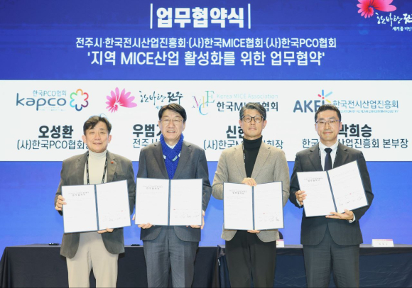 특히 전주시는 이날 행사에서 한국전시산업진흥회(회장 이준승), (사)한국MICE협회(회장 신현대), (사)한국PCO협회(회장 오성환)와 지역 마이스산업 및 전주컨벤션센터 활성화를 위해 기관 협력체계를 구축하고, 기관 간 교류와 협력, 공동사업 발굴, 국내외 행사 유치 등에 협력키로 하는 내용을 골자로 한 업무협약을 체결했다.