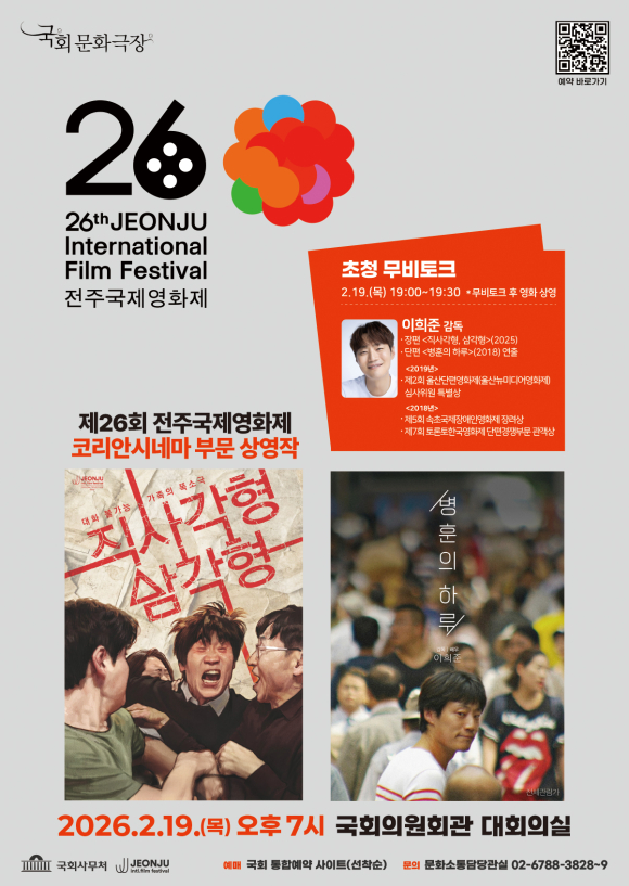 두 작품은 2월 19일 오후 7시에 국회의원회관 대회의실에서 상영되며, 상영에 앞서 두 작품의 연출을 맡은 이희준 감독과의 무비토크가 마련돼 관객과 직접 소통하는 시간을 가질 예정이다. 예매는 2월 5일부터 대한민국 국회 통합예약 사이트(https://reservation.assembly.go.kr/)에서 진행된다.
