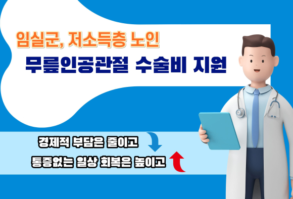 임실군은 무릎관절증으로 일상생활에 어려움을 겪고 있으나 경제적 사정으로 수술을 받지 못하는 저소득층 노인을 위해 무릎 인공관절 수술비 지원사업을 추진하고 있다.