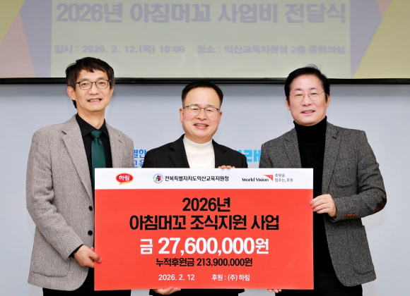 하림은 2월 12일 오전 익산교육지원청에서 월드비전, 익산교육지원청과 함께 아침 결식이 우려되는 지역 초등학생들을 위한 ‘2026년 아침머꼬 조식지원사업’ 업무협약을 체결하고 후원금 2,760만 원을 기탁했다고 밝혔다.