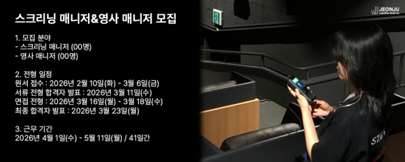 모집은 2월 10일부터 약 한 달간 진행되며, 전주국제영화제 홈페이지(https://www.jeonjufest.kr/)에서 지원서 다운로드 후 이메일(tech@jeonjufest.kr)로 제출하면 된다.