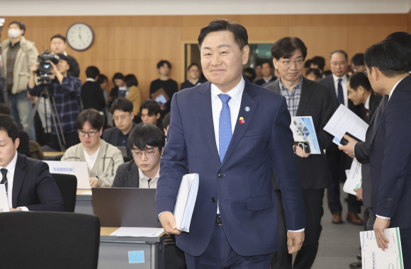 | ↑↑ 지난 2월 27일 전북특별자치도청 브리핑룸에서 김관영 도지사가 이재명 대통령 전북 타운홀미팅과 현대차그룹 대규모 투자와 관련해 기자 브리핑을 하고 있다. |