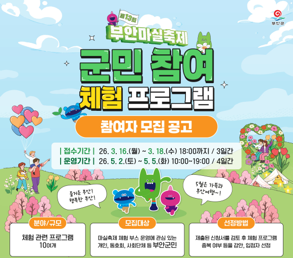 부안군 대표축제추진위원회(위원장 김종문)는 오는 5월 2일부터 5일까지 4일간 부안 해뜰마루 지방정원에서 개최되는 제13회 부안마실축제 군민 참여 체험 프로그램 운영자를 공개 모집한다고 밝혔다.