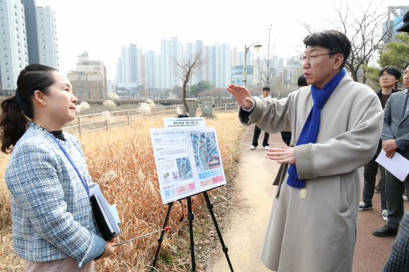 이어 우 시장은 효자4동으로 자리를 옮겨 저류지 용도변경 및 해당 부지에 연꽃과 창포 식재를 요청한 용호근린공원 현장을 둘러봤다.